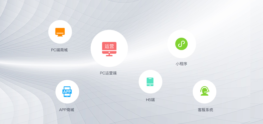 PC端商城、PC運(yùn)營(yíng)端、H5端、小程序、APP商城、客服系統(tǒng)。